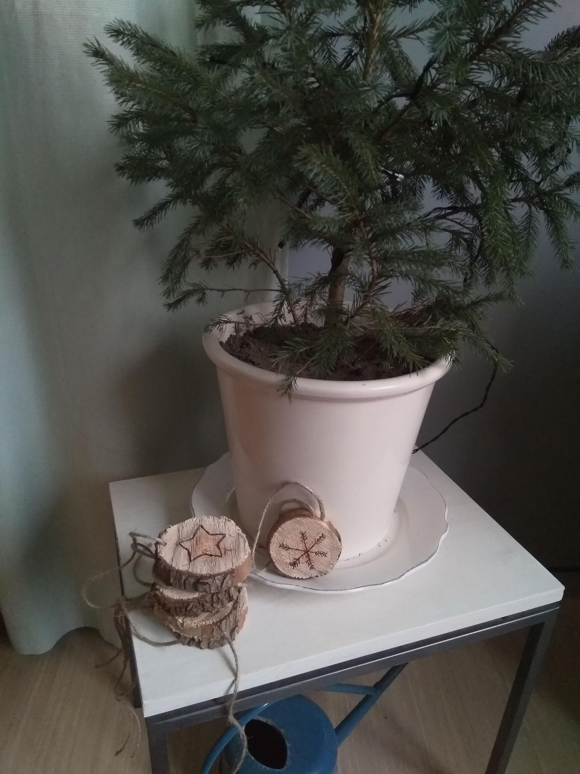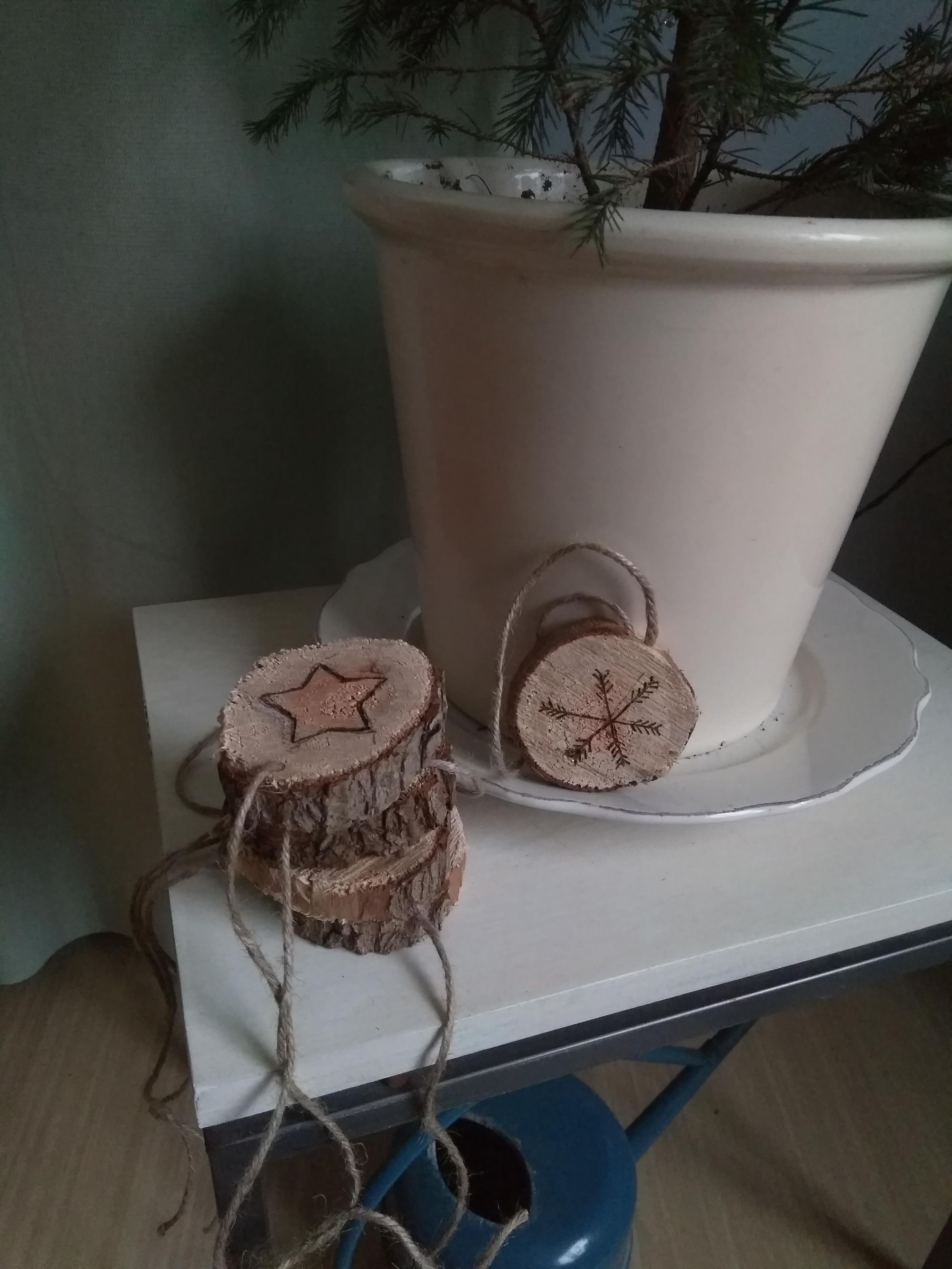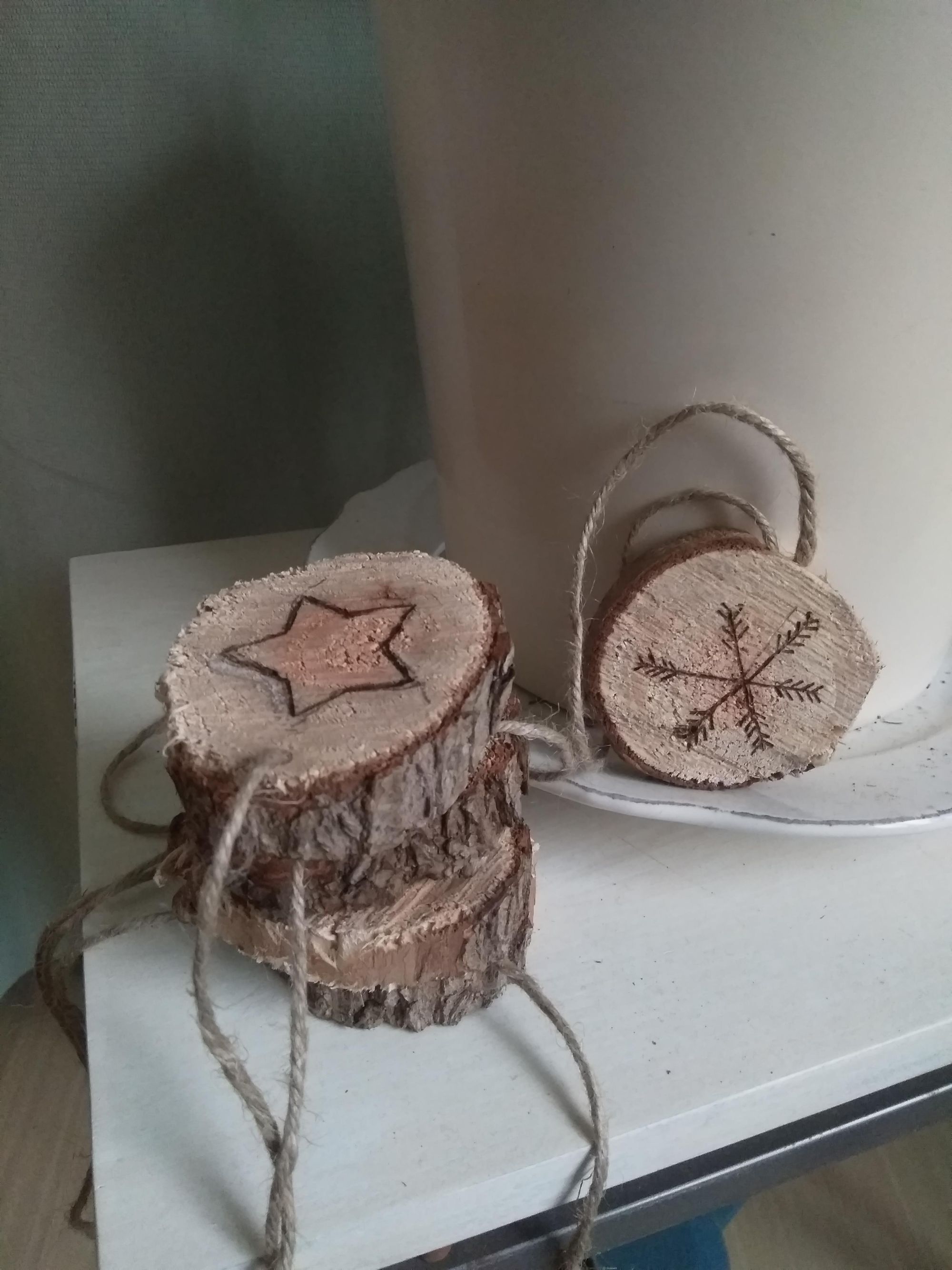 Zaag een dun rond houtblok in blokjes en schuur beide kanten met wat schuurpapier. Maak vervolgens met een soldeerbout of een houtbrander figuurtjes naar jouw wensen. Met potlood overtrekken werkte niet zo goed, daar brandt de houtbrander niet goed doorheen. Als de blokjes af zijn kan je er een gaatje inboren en er een leuk touwtje doorheen doen. Zo heb je snel simpele maar hele gezellige zelfgemaakte kerstversiering. Ik had het geluk dat mijn opa in zijn schuurtje een houtbrander had liggen, dingen lenen van mensen geeft ook meteen weer een leuk praatje en maakt verhalen los :)