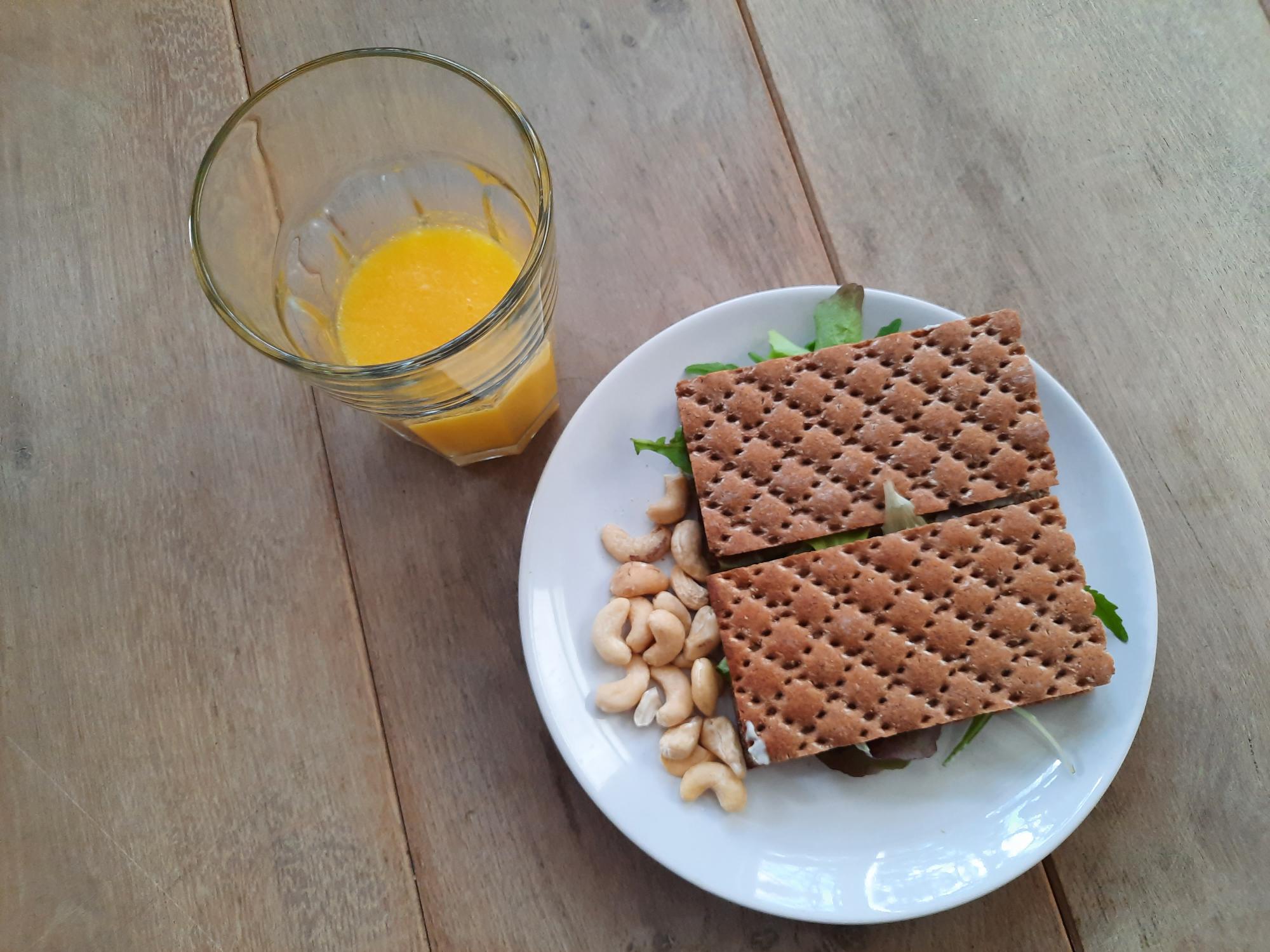 Lunch: Knäckebröd met vegan heksenkaas en sla, een handje ongezouten cashewnoten en een glas sinaasappelsap