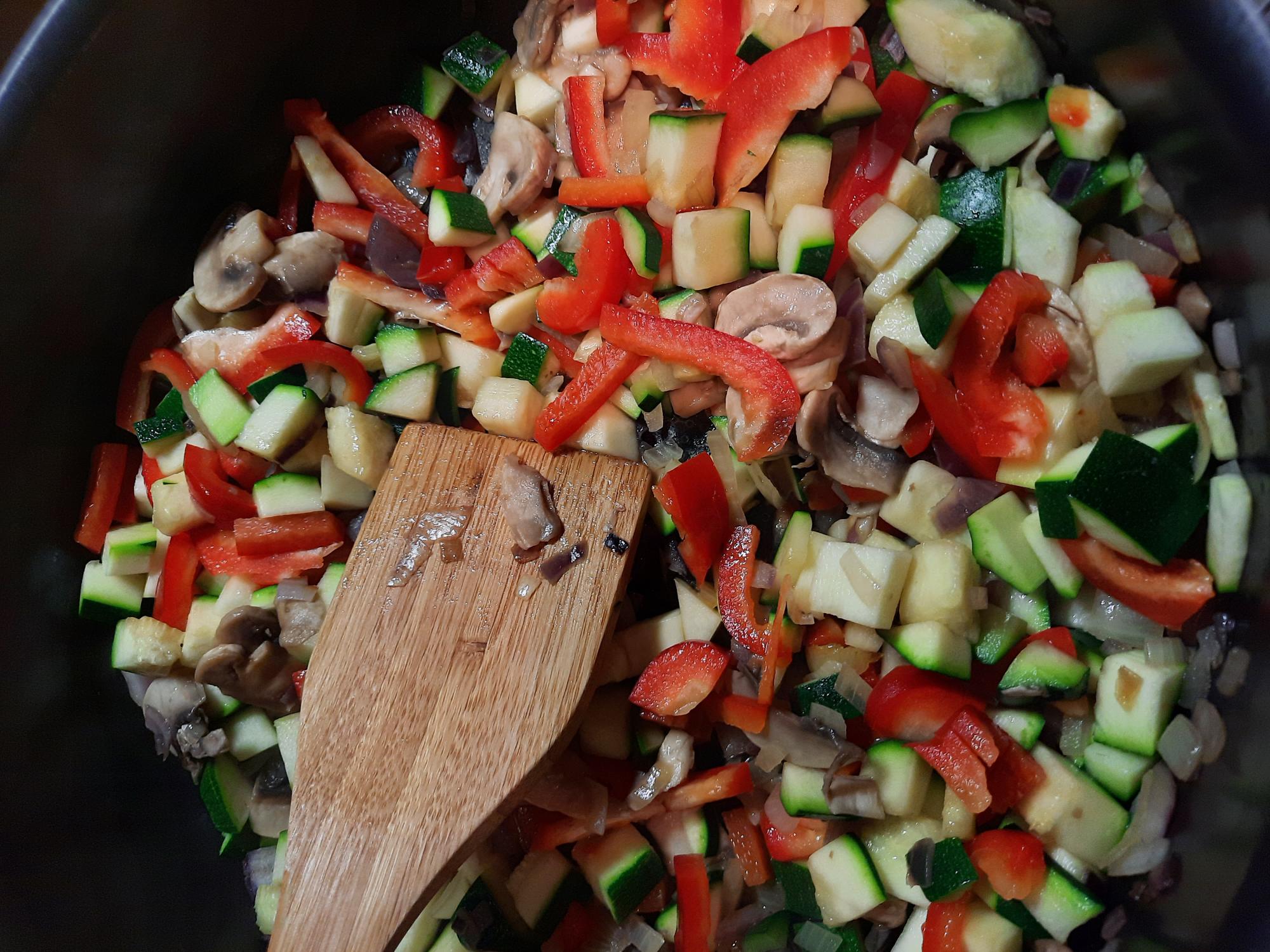 Diner: Chili sin carne met bruine bonen, knoflook, ui, paprika, champignons, courgette, augurk, jalapeño pepertjes, tomatenblokjes, vegan gehakt en zakje kruiden.