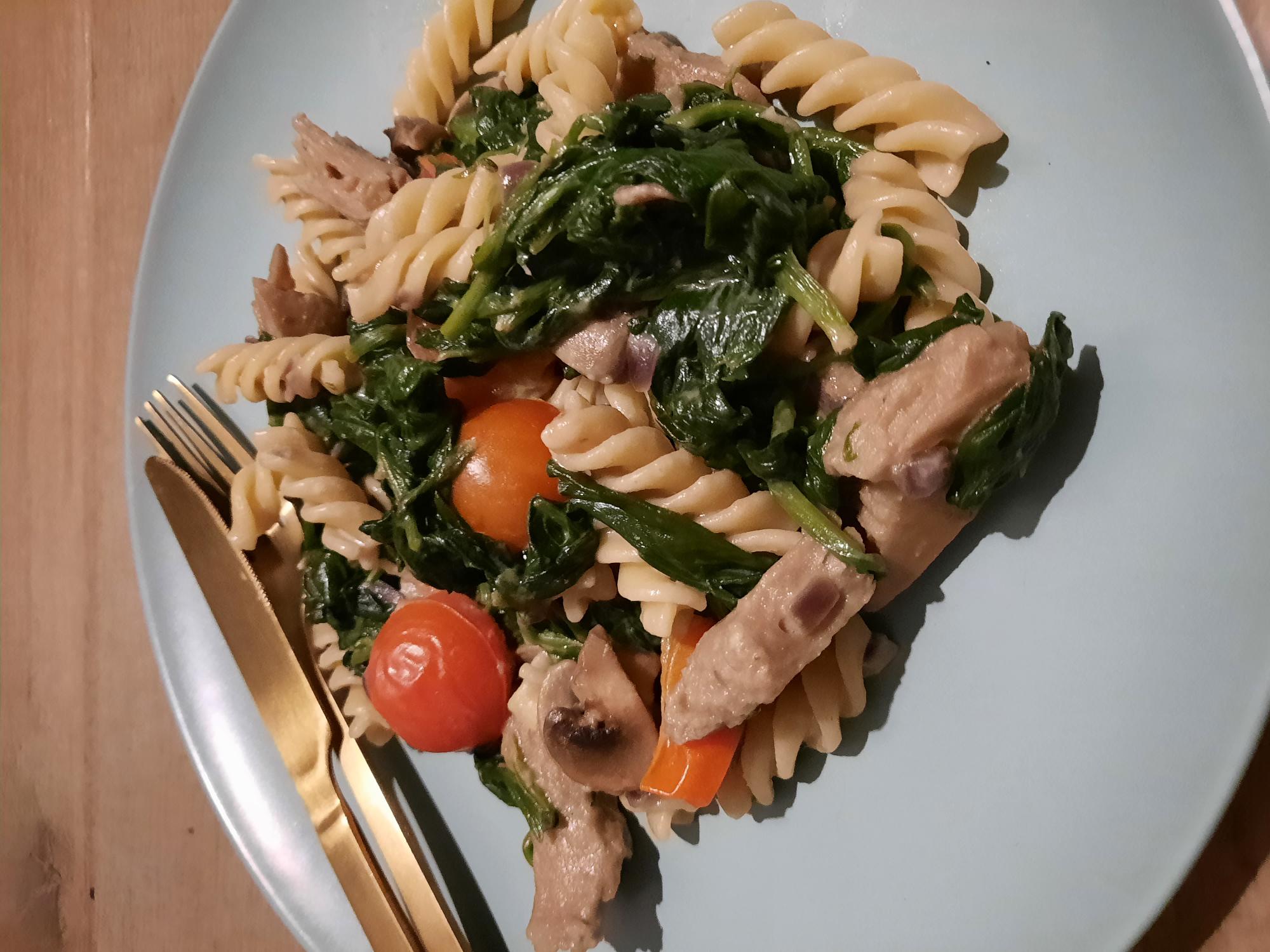 Diner: Pasta met vegan "kip", spinazie, tomaatjes, champignons, ui en vegan Boursin en als toetje een smoothie met banaan, blauwe bessen en havermelk