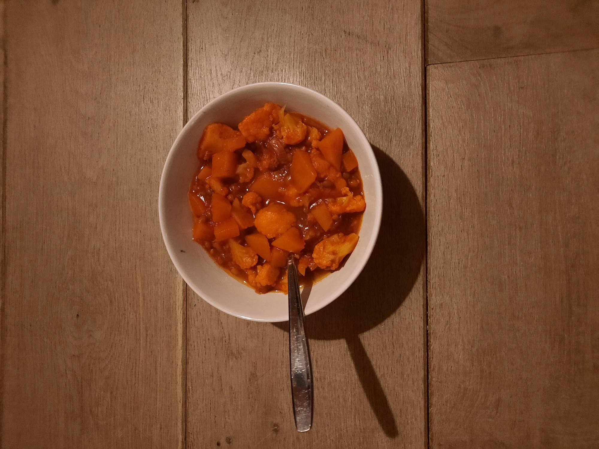 Diner: Harissa stoofschotel met pompoen, linzen en couscous en als toetje vegan tiramisu